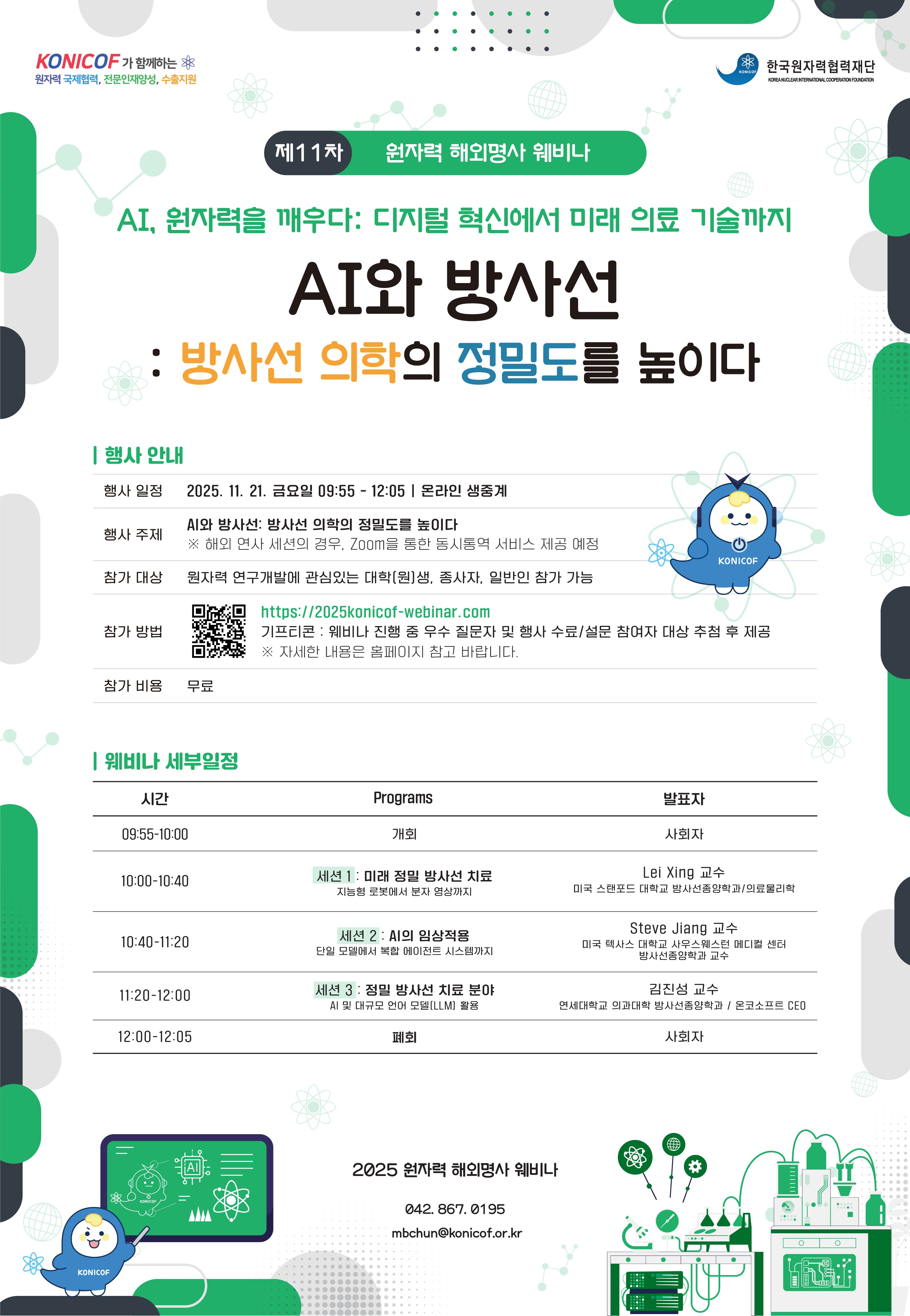 11월 21일(금) 09시 55분에 제11차 원자력 해외명사 웨비나가 "AI와 방사선: 방사선 의학의 정밀도를 높이다"라는 주제로 개최됩니다.