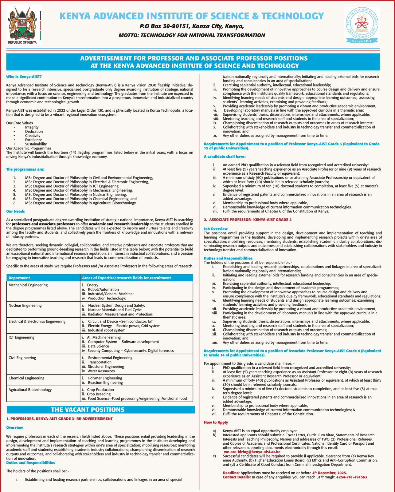 - [KENYA-AIST]Advertisement for Professor and Associate Professor Positions