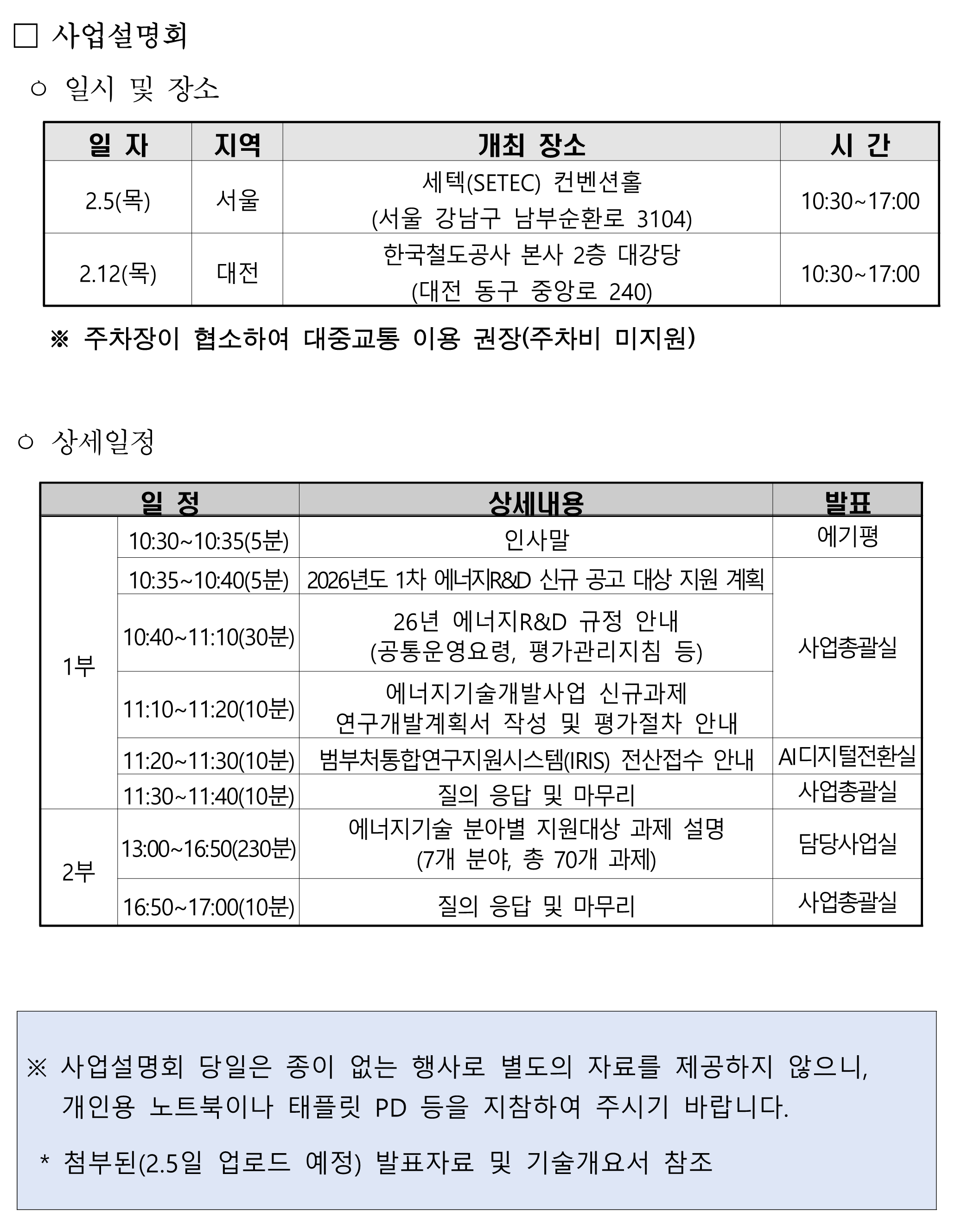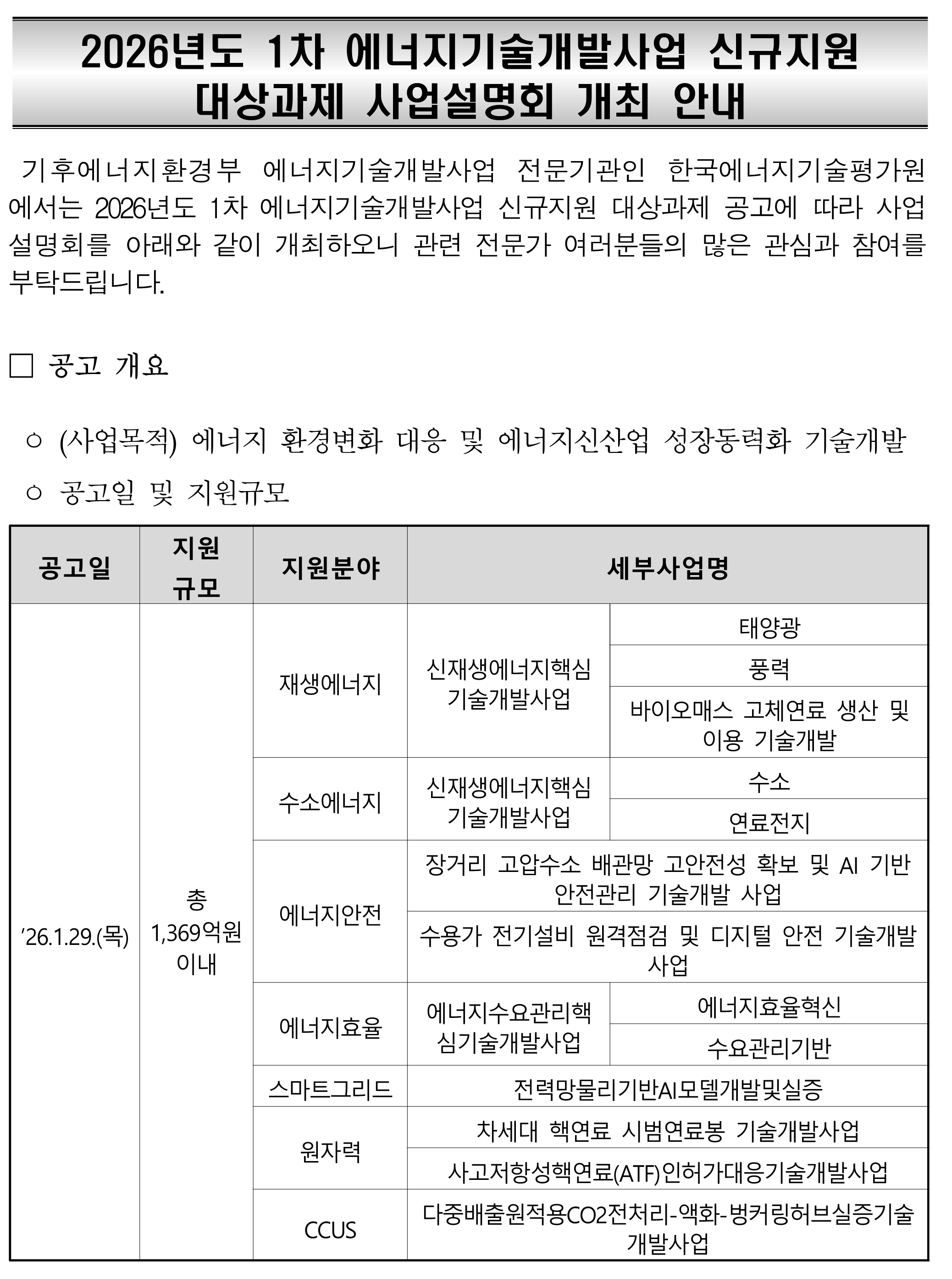 [한국에너지기술평가원] 2026년도 제1차 에너지기술개발사업 신규지원대상 사업설명회 개최 안내