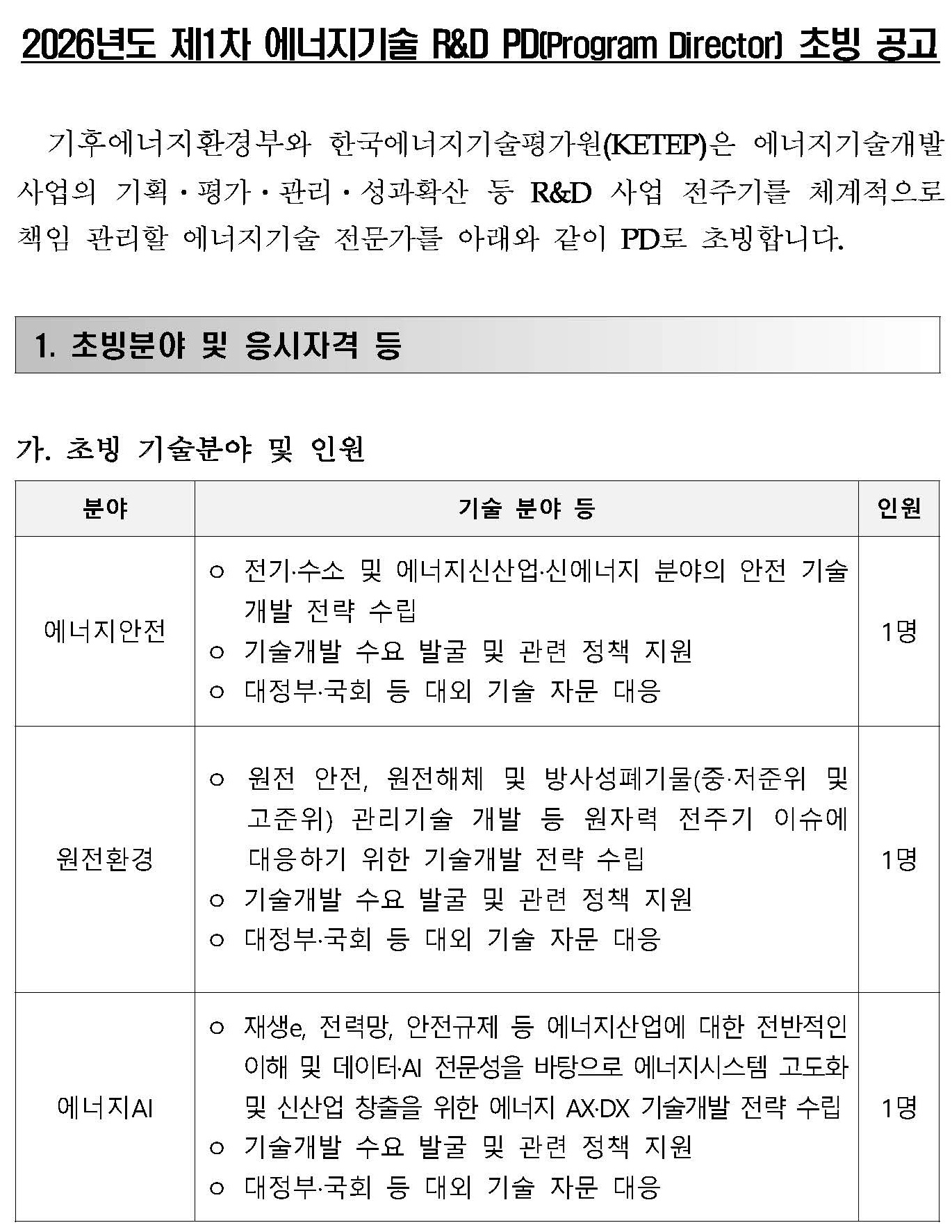 한국에너지기술평가원 ‘26년도 제1차 에너지기술 R&D PD 초빙 공고