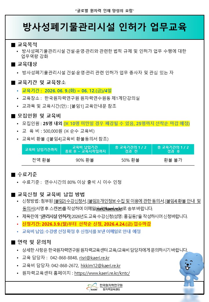 [한국원자력연구원]2026년도 방사성폐기물관리시설 인허가 업무 교육과정 안내