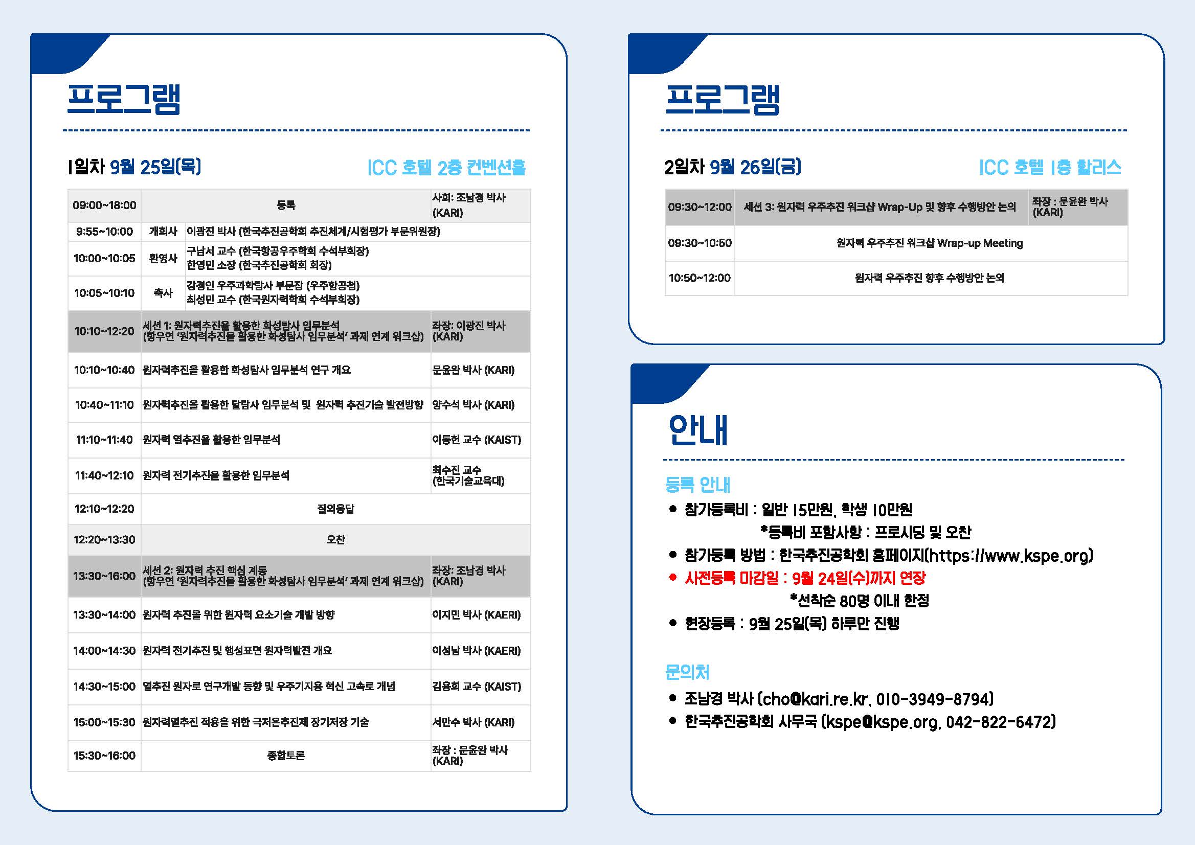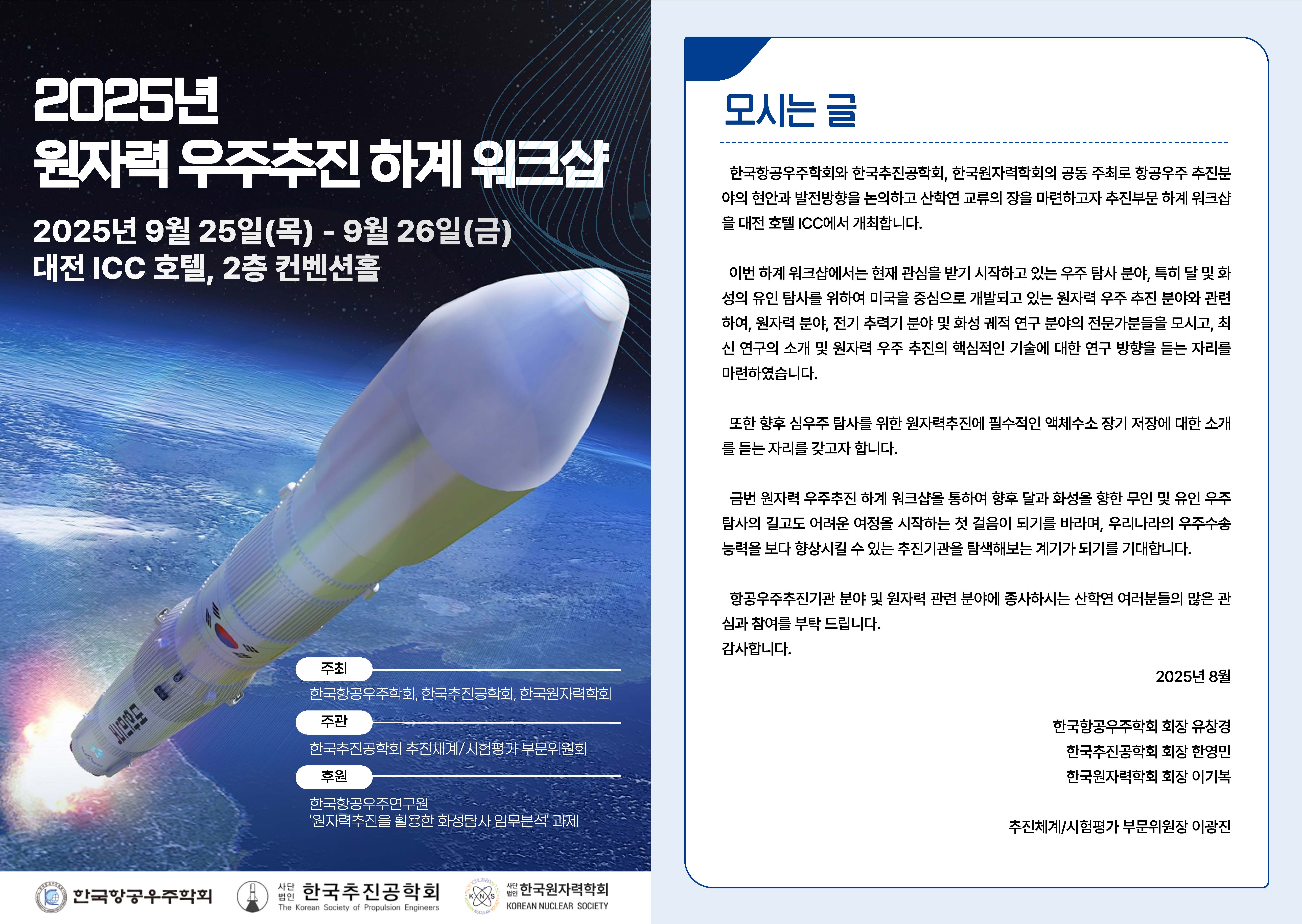 - (등록 기간 연장) (한국항공우주학회, 한국추진공학회, 한국원자력학회) 원자력우주추진 하계 워크샵 개최 안내