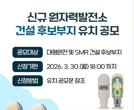 한수원은 30일 제11차 전력수급기본계획에 반영된 신규원전(대형원전 2기, SMR 1기) 부지 확보를 위한 후보부지 유치공모를 시작한다고 1일 밝혔다.