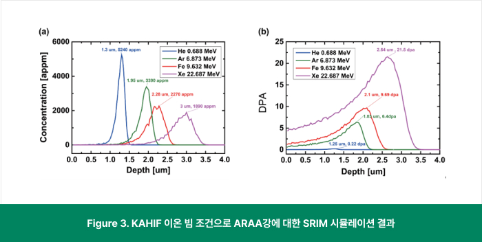 □ 손상 모사 시뮬레이션: KAHIF는 He, Ar, Fe 등 다양한 이온빔을 핵융합 재료(예: 저방사화강 ARAA) 조사에 활용하며, SRIM 코드를 이용해 깊이에 따른 DPA(원자 변위) 및 이온 농도 분포를 예측합니다.