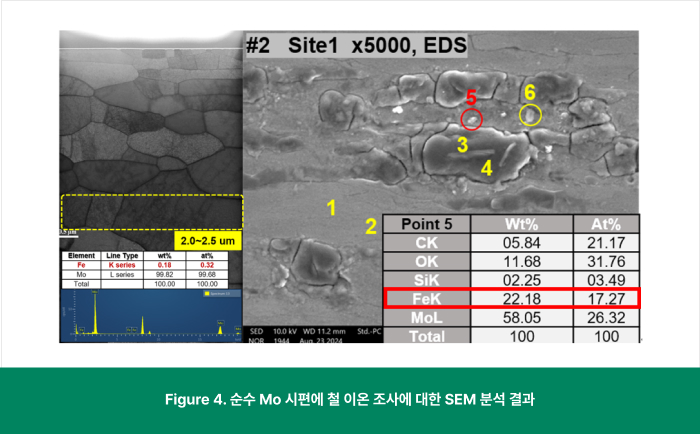 □ Fe 이온빔 검증: Fe 이온빔(9.605 MeV) 생성 및 가속 성능을 검증하기 위해 순수 몰리브덴(Mo) 시편에 Fe 이온을 조사하는 실험을 수행했습니다.