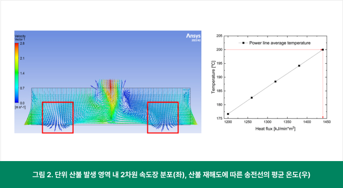 CFD(Computational Fluid Dynamics) 방법을 기반으로 산불 상황을 모사하여 송전선이 기능을 상실하게 되는 산불의 재해도 수준을 도출하였다.