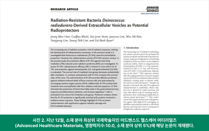 - ※ 특논문명: 방사선 저항성 미생물 데이토코커스 라디오듀란스 유래 세포외 소포체의 잠재적 방사선 방호제로서의 가능성(Radiation-Resistant Bacteria Deinococcus radiodurans-Derived Extracellular Vesicles as Potential Radioprotectors)
