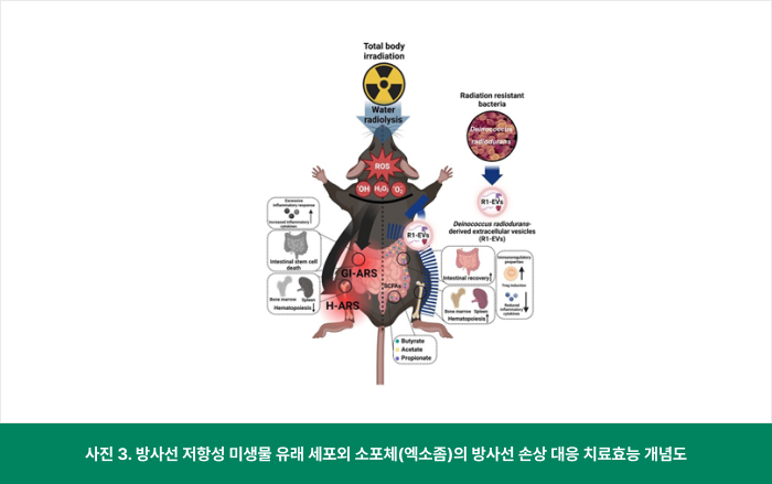 - o 기존의 방호제는 화학 물질로 제조하는 방식이 일반적이다. 미생물을 활용해 방사선 방호제를 개발하는 시도는 원자력연구원이 최초다. o 연구원 변의백 박사팀은 먼저 데이노코커스 라디오두란스를 대량으로 배양해 초원심분리로 엑소좀을 분리했다. 그리고 연구원이 보유한 연구용 방사선 조사시설을 활용해 방사선 피폭량과 신체 손상의 상관관계를 알 수 있는 방사선 피폭·손상 모델을 설계했다. 그 후 실험용 쥐 그룹을 둘로 나눠, 한쪽에는 엑소좀을 투여하고 나머지는 그대로 두었다. 약 한 시간 뒤 방사선 8Gy(그레이, 일반적인 암치료 1회 시 방사선량: 2~3Gy)을 양 그룹에 조사(照射)한 결과, 엑소좀 투여 그룹의 생존율이 비투여 그룹 대비 70% 가량 증가한 것을 알 수 있었다.