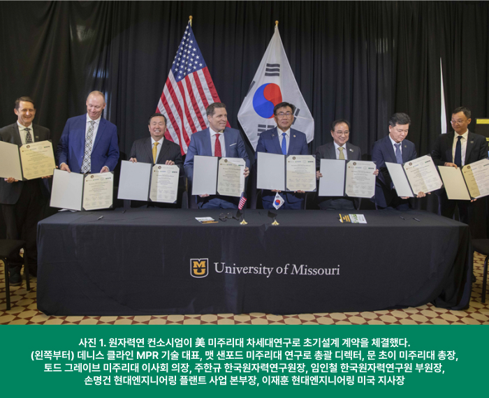 - 원자력연 컨소시엄, 美 미주리대 차세대연구로(NextGen MURR) 설계 수출 계약 체결 - - 66년 전 미국 도움으로 시작했던 연구로, 미국으로 수출 성공 -- □ 과학기술정보통신부(장관 유상임, 이하 ‘과기정통부’)는 한국원자력연구원·현대엔지니어링· MPR 컨소시엄*(이하, 컨소시엄)이 미국 미주리대학교가 국제 경쟁입찰로 발주한 미주리대 「차세대연구로 사업(NextGen MURR**프로젝트)」의 첫 단계인 초기설계*** 계약을 체결했다고 17일 밝혔다.