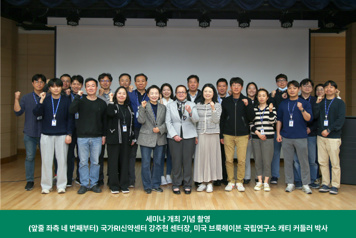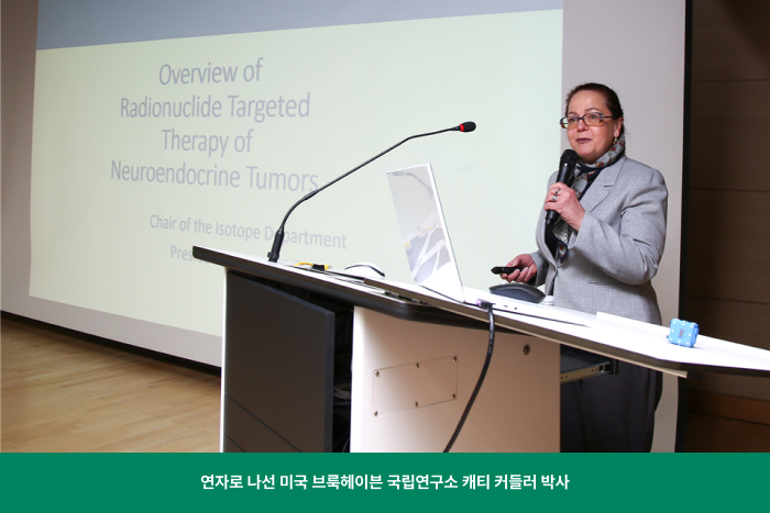 - □ 이번 세미나에는 방사성동위원소 분야의 세계적 석학인 캐티 커들러 박사(미국 브룩헤이븐 국립연구소)가 연사로 초청되어 주목을 받았습니다. 커들러 박사는 미국 핵의학 및 분자영상 학회(SNMMI) 회장이자 브룩헤이븐 국립연구소 동위원소 연구·생산 부서의 의장으로, 치료용 방사성동위원소 개발 및 생산 분야를 선도하는 전문가로 평가받고 있습니다.