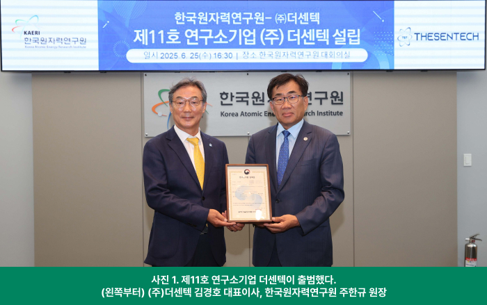 - □ 더센텍 김경호 대표이사는 “연구원 창업기업으로 시작한 이래 부단한 노력 끝에 연구소기업으로 승인받게 되어 감회가 새롭다”며 “연구소기업으로 성장하기까지 함께해 주신 한국원자력연구원과 관계자분들께 깊이 감사드린다”고 밝혔다.