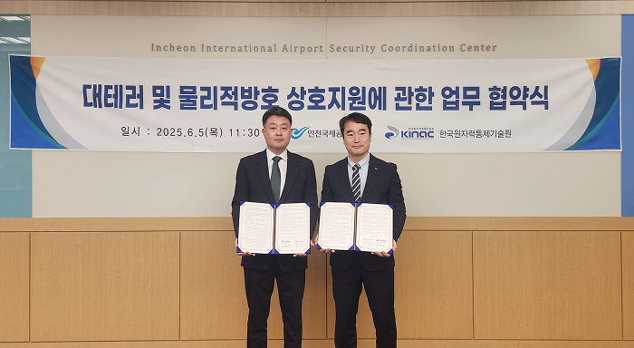 - ▣ 한국원자력통제기술원(원장 이나영, 이하 기술원)은6월5일, 인천국제공항공사(사장 이학재, 이하 공사)와 대테러 및 물리적방호 분야 협력을 위한 업무협약(MOU)을 체결했습니다. 기술원은 핵비확산과 핵안보 규제 전문기관으로서, 원자력시설 및 핵물질에 대한 물리적방호 규제를 수행하고 교육훈련을 제공함으로써 원자력의 평화적 이용을 지원하고 있습니다. 공사는 세계3위 규모의 국제공항 운영기관으로, 항공 보안검색 분야에서 세계 최고 수준의 역량을 인정받고 있습니다.