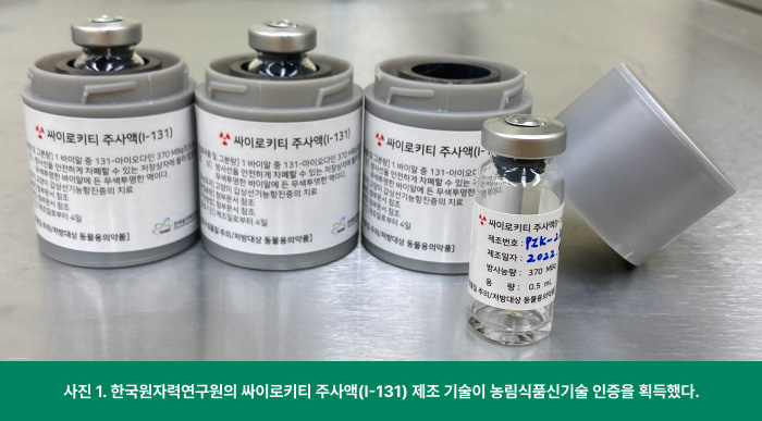 - □ 한국원자력연구원은 동물용 방사성의약품인 갑상선기능항진증 치료제 ‘싸이로키티 주사액(I-131)’이 방사성의약품으로는 국내 최초로 농림축산식품부의 농림식품신기술(NET) 인증을 획득했다고 30일 밝혔다.