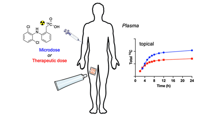 - - 전신 약물 흡수율을 측정하기 위해 24시간 동안 정맥에서 채취한 혈액을 분석한 결과, 혈액의 총 탄소-14 농도는 극미량 투여시 평균 1.65pg/mL였고, 실제 치료용량 투여 시 평균 0.43pg/mL로 나타나, 실제 치료용량 보다 극미량 투여 시 전신 흡수율이 평균 3.84배 높은 것을 확인했다.