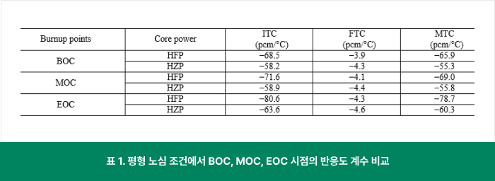□ 노심 안전성 측면에서도 모든 주요 반응도 계수가 안정적인 특성을 보였다. 특히 연소 과정 전반에 걸쳐 연료온도계수(FTC), 감속재온도계수(MTC), 그리고 통합온도계수(ITC)가 모두 음의 값을 유지하는 것으로 나타났으며, 이는 노심의 고유 안전성이 충분히 확보됨을 의미한다. 이러한 결과는 논문 Table 4에서 제시된 온도계수 분석 결과와 일관된 경향을 보이며, Table 6에 정리된 연소도 및 우라늄 이용 효율 분석 결과에서도 LEU+ 기반 설계가 기존 SMR 설계 대비 연료 활용도 측면에서 뚜렷한 개선 효과를 제공함을 확인할 수 있다.